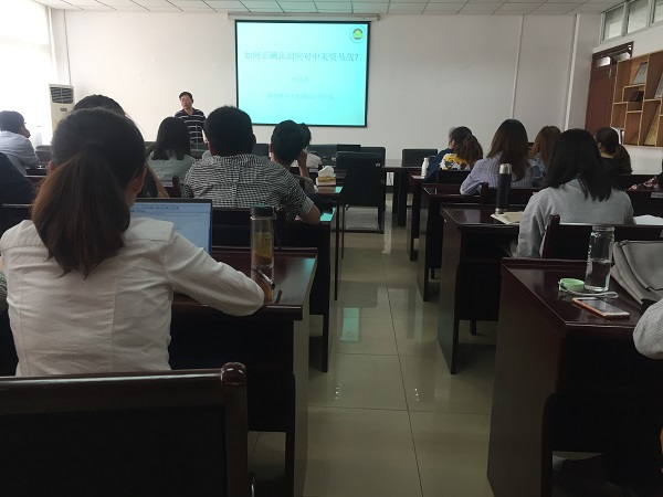 2018-05-10色情网 举办第16期青年学者论坛——我校副教授杜运苏做讲述“如何正确认识及应对中美贸易战”
