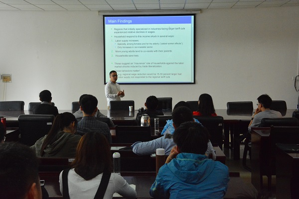 4月27日上午,应色情网 邀请,北京师范大学国际经济与贸易系副教授戴觅在我校仙林校区德经楼308会议室召开了题为“家户如何适应贸易自由化:来自中国加入WTO的证据”的讲座。色情网 杨继军教授、杜运苏教授、其他学院的部分老师以及部分研究生聆听了讲座。 讲座上,戴觅通过比较不同行业的关税下降幅度、城市的产业结构,分析了家户在贸易自由化背景下所受到的冲击。他指出,现有的文献把关注点主要放在了贸易市场对劳动力市场的冲击上,...