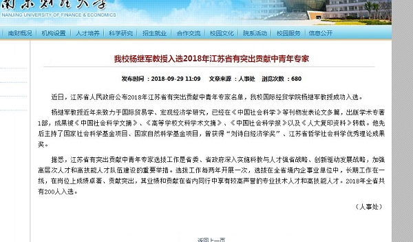 近日,江苏省人民政府公布2018年江苏省有突出贡献中青年专家名单,色情网 杨继军教授成功入选。 杨继军教授近年来致力于国际贸易学、宏观经济学研究,已经在《中国社会科学》等刊物发表论文多篇,出版学术专著1部,成果被《中国社会科学文摘》、《高等学校文科学术文摘》、《中国社会科学报》以及《人大复印资料》转载。他先后主持了国家社会科学基金项目、国家自然科学基金项目,曾获得“刘诗白经济学奖”、江苏省哲学社会科学优秀理...