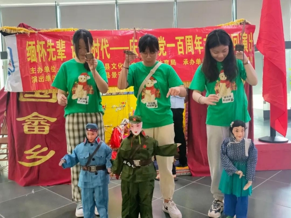 随后小队又来到大张坑的人民大会堂、畲乡之窗旅游景区,在那里,一批又一批的旅客正举着小型国旗参观,当地工作人员说,“红色旅游业已经成为景宁经济的重要一环,我们争取将红色基因真正融入畲乡建设。”正值中国共产党成立一百周年,畲乡人民以非遗木偶戏的形式举办了一场“缅怀先辈,讴歌时代”为主题的庆祝建党一百周年巡回演出,小队成员也有幸体验了一把,通过红色旅游,畲乡正不遗余力地建设乡村文化、乡村经济。