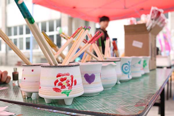 在仙林校区中苑外场开展了“指尖上的温柔梦”女生节创意DIY活动。同学们利用回收而来的废旧指甲油和陶瓶、筷子之类的原始工艺品,进行指甲油手绘DIY工艺品的创作。