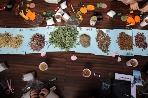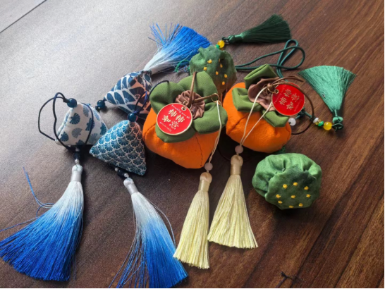 会议室的长桌上早早地摆上了制作香囊所需的布料、针线等制作香囊的原材料,玫瑰花、白芷、太华、藿香、丁香、薄荷、茉莉、迷迭香等原料一字排开,香料的不同组合搭配组合成一个个“舒肝解郁”“温经安神”配方,供老师们选择。在动手制作前,学院工会主席张朋朋老师为大家介绍了香囊的制作方法和香囊药方配伍。大家喝着洛神花玫瑰茶,听着悠扬婉转的音乐,感受到了“何以致叩叩,香囊系肘后”的文化内涵与艺术魅力。随后,老师们便根据自身的需求,发挥奇思妙想,在一针一线的缝制过程中,创作出一个个立体饱满、独具特色的香囊——有绿意盎然的莲蓬香囊,也有带有美好祝愿的“柿柿如意”香囊......