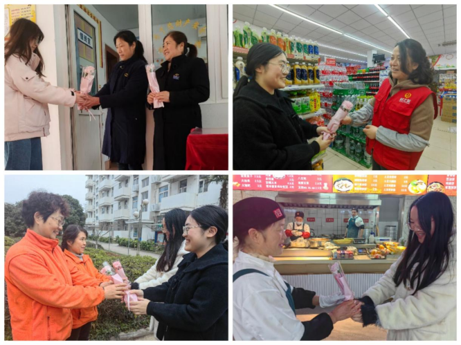 的志愿者们在三八节前夕为我校女教职工送上鲜花与祝福贺卡,以表敬意。志愿者们去到了宿管站、超市与食堂,细心留意才发现,朴素的中国女性在点点生活中展现着巾帼不让须眉的美丽。食堂的阿姨们在为接下来的晚餐忙碌着、保洁阿姨仔细清扫着教室走廊的卫生,宿管阿姨们则是在倾听着来访同学们的烦恼与心事,并不时给她们提供鼓励与建议。她们在平凡岗位上默默坚守,维护了校园生活的和谐与有序。“阿姨您工作辛苦了,祝您妇女节快乐,这是为您准备的鲜花,祝您工作顺利,心想事成!”