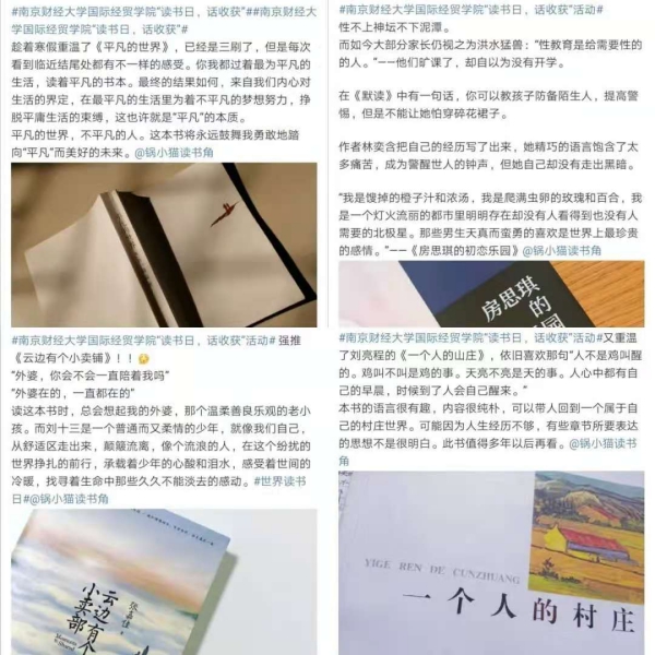 在微博上创建了读书分享话题,并在话题内号召大家将使自己受益匪浅的书籍及阅读感受进行分享。百余名同学进行了话题分享,每人在7天内精读一本书,并在微博上进行读后感受的交流互动。
