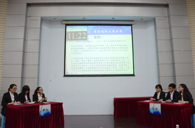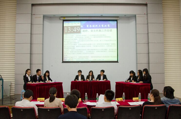 经过初赛的激烈角逐,共有六支代表队从仙林九所高校的三十多支队伍中脱颖而出,进入决赛。决赛分为“商务谈判”和“三方会谈”两个环节。在“商务谈判”环节中,“圈圈叉叉”队和“我们说的都”队分别模拟北京银行和浙江丰祐珠宝有限公司进行商谈,双方就能否寻找合理的合作方式,互相谋求现阶段的共赢进行了正面博弈,妙语连珠,精彩纷呈。“和风”队和“满汉全席”队就上海国有出租车调度中心和滴滴打车的利益分配进行激烈谈判,双方代表口若悬河,互不相让,赢得台下阵阵掌声。“Miss JNZ”队和“万万没想到”队分别模拟携程旅行网和艺龙旅行网,就同行间的冲突与合作进行洽谈,双方代表才思敏捷,出色的发挥赢得了评委老师的一致赞扬。在“三方会谈”环节中,进入巅峰对决的三个队伍分别模拟深圳市政府领导、佳兆业集团高层与业主三方就“佳兆业房产纠纷”进行协商,参赛选手们谈吐风趣,应答如流,掀起整场比赛的高潮。