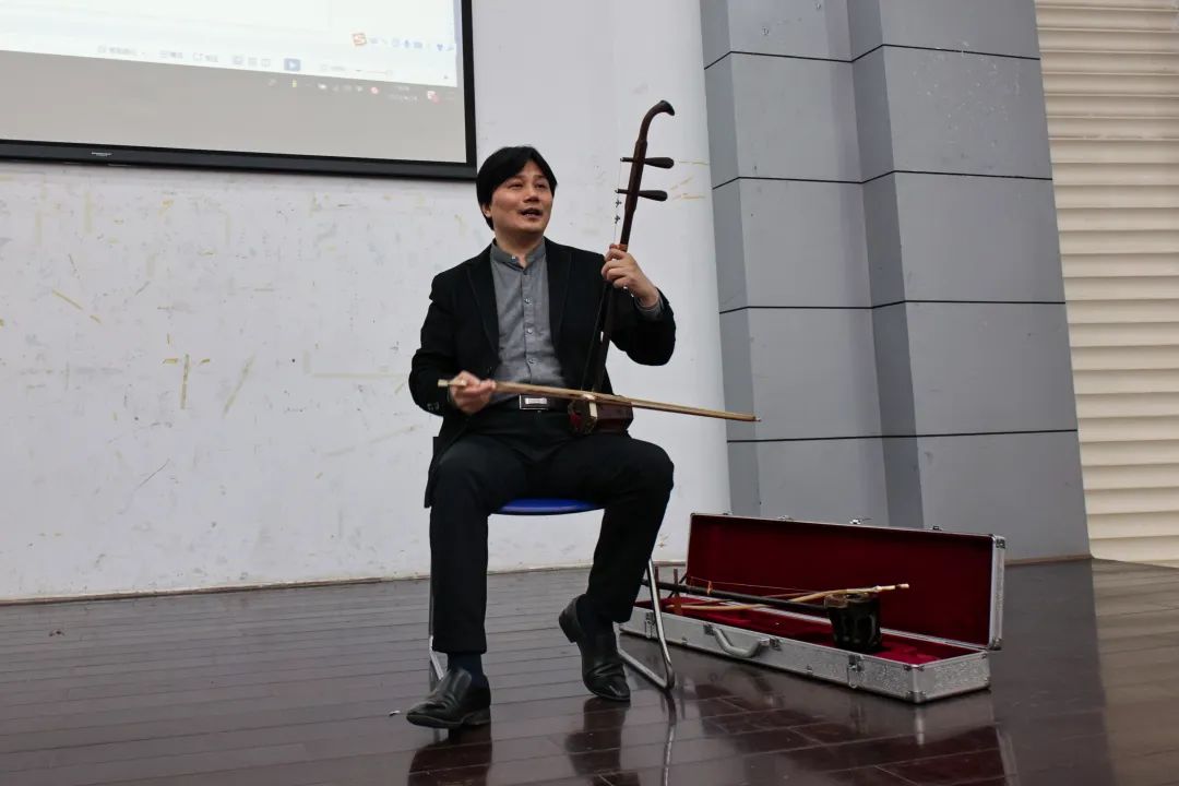 接着,林东坡教授从国乐的“音乐形态”和“艺术表现”两方面特征入手,带领大家深入了解国乐的魅力。他提到国乐的音乐形态有三个特征:近人声之音色,五声性之音调,线性化之旋律。在现场,为了让大家更好地体验国乐近人声的音色,林东坡老师用二胡模拟鸟叫和马鸣声让大家领略了国乐的拟声之美。他还指出国乐的曲子常常是用单音来完成的,单音连成一条线,所以也可称为线性化旋律,这一点与西方惯用的和音如交响乐,有着明显的不同。