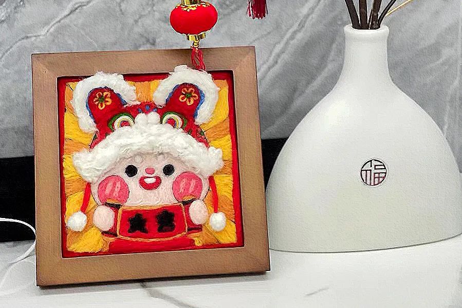 五颜六色的毛毡放在大概位置,再耐心地用针一遍遍将毛毡压实,精美的毛毡画便逐渐呈现在同学们的手中。这些毛毡画的图案五花八门:有的是小兔子头戴老虎帽子样式的,象征着辞旧迎新;有的是小兔子抱着麻将样式的,象征着新的一年会财源滚滚。各式各样的精美图案代表着同学们对新年的美好祝愿。