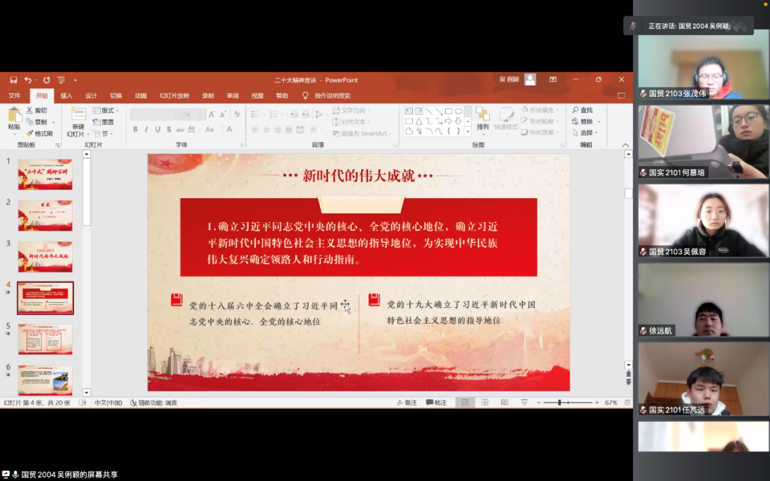 首先,她从记录中国新时期的发展出发,历数新时代的伟大成就,从确立习近平同志党中央的核心、全党的核心地位以及新时代中国特色社会主义思想的指导地位;加强党的全面领导,深入推进全面从严治党和自我革命;坚持和完善中国特色社会主义制度,积极推进国家治理体系和治理能力现代化;全面建成小康社会,开启全面建设社会主义现代化国家的新征程;到坚定文化自信,强化马克思主义在意识形态领域中的指导地位。一个逐渐完善、强大的党,一个逐渐富裕、强大的国家,一个逐渐安稳、自信的社会浮现在青马班的同学眼前,民族情怀和自豪感油然而生。