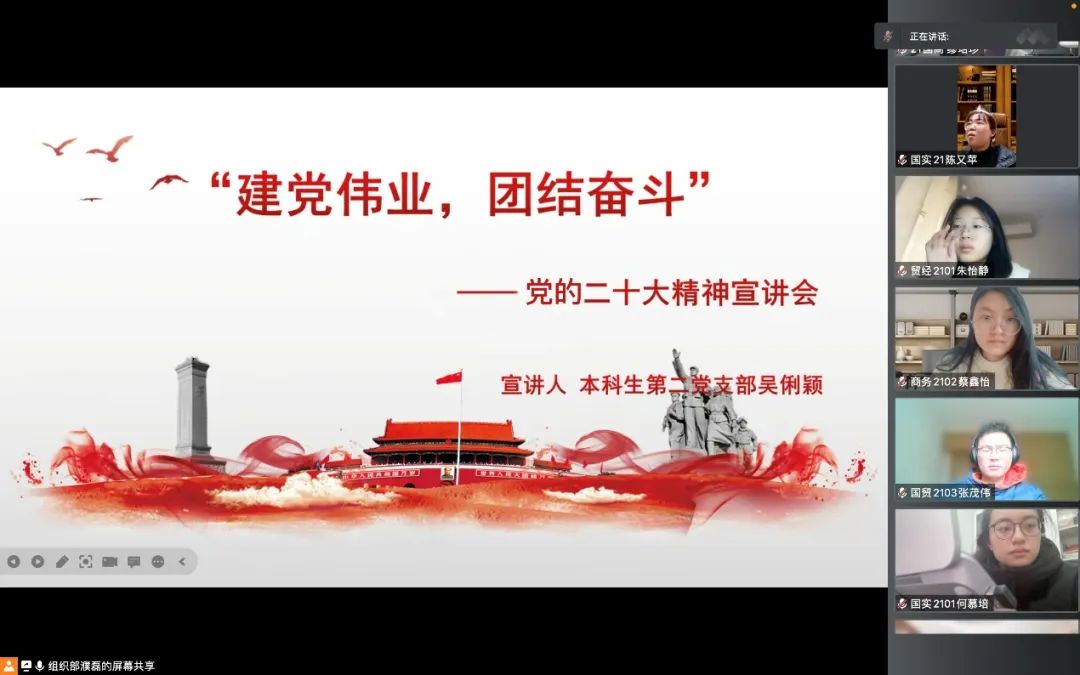 最后, 吴俐颖同学就如何将深入学习贯彻党的二十大精神与青年的目标理想相结合,就青年学子如何体悟学习党的二十大精神这一命题给出了她的看法。她认为,青年学子要学好党的二十大精神,一是要会学,即把握党的二十大报告的内容,整体把握,再突出重点,最后联系实际将党的二十大精神融入日常生活;二是要会讲,即会表达自己,把自己的学习体会分享给同学朋友,在说和讨论的过程中会有不一样的视角和更深的体会。三是要学思践悟,即将理论学习付诸实践,做宣讲的能手,自律的表率。