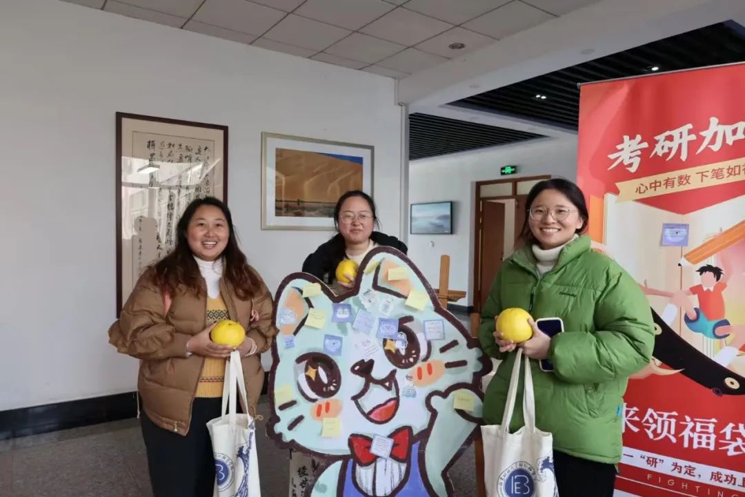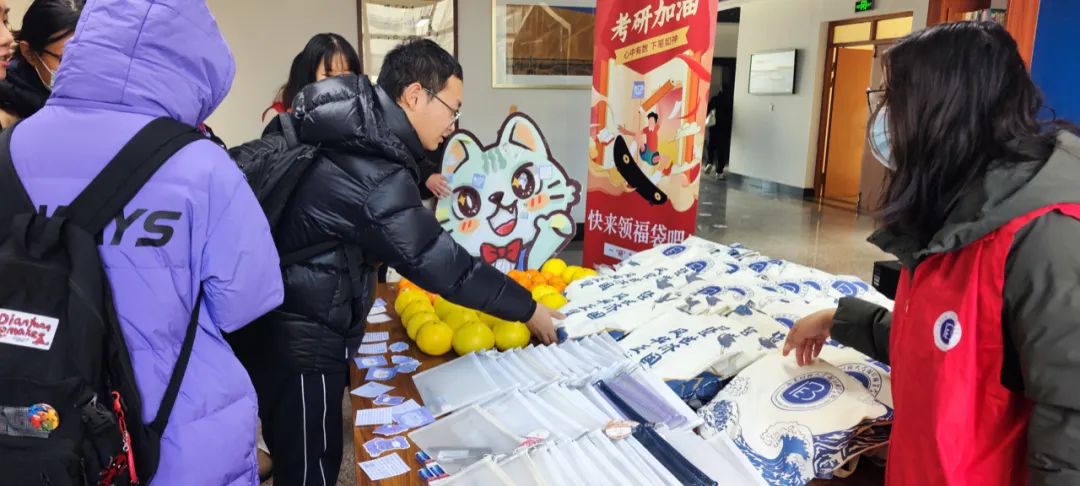 此外,志愿者们还来到图书馆门口、考研教室内、宿管站前,为在那里积极备考的学子们送去了福袋。