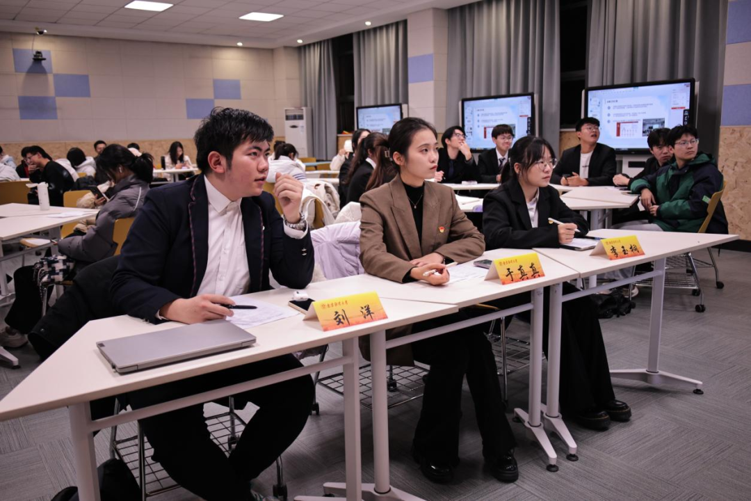 于博文楼101举办“尚德明理,善学笃思”23级团支书述职大会。学院分团委副书记于真真、李玉桐、刘洋,及部分学生代表出席本次会议。会议由王晓瑜同学主持。会议第一个议程,各团支部书记按顺序上台进行述职并答辩。各团支书总结了本学期包括智慧团建录入、PU信息录入、主题教育及党史学习等一系列活动的完成情况,调研搜集了团员评价和团员满意度,反思了工作中存在的不足,并对未来支部建设的规划进行汇报。答辩环节中,评委们对各团支书的述职情况进行了点评提问,明确指出汇报中存在的问题,同时也针对材料收集不及时、反馈问题不及时等问题提出了相应的建设性意见。
