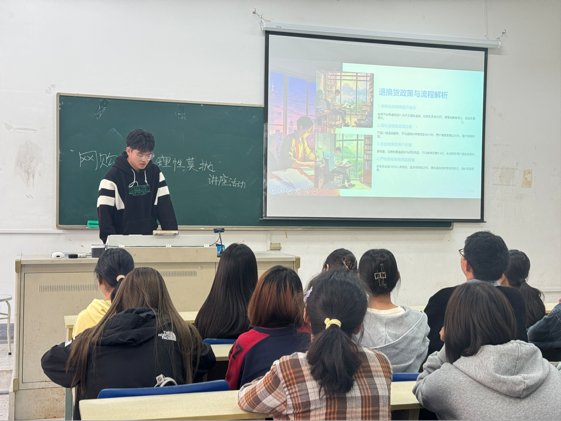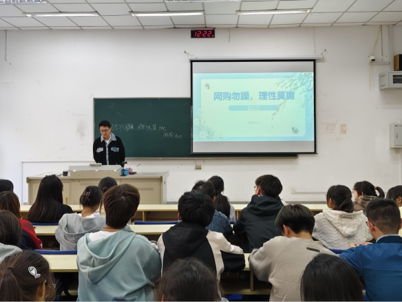 接着,蒋佳成同学从理性消费的重要性入手,告诫同学们狂欢之余,勿忘理性。呼吁同学们在购物时要做到长期规划与短期满足相平衡,消费后要进行满意度与负债管理,防止过度消费,减少后悔度,让消费成为提升生活的助力而非负担。除此之外,他还从商家常用的优惠券和促销陷阱角度,例举了真假优惠券、叠加优惠虚抬价格及预售和秒杀的风险等问题。助力同学们避免调入价格陷阱而冲动消费,提升购物效率,保持理性消费。在售后服务保障方面,他向同学们介绍了退换货的政策与流程以及售后问题的处理技巧。大学生需明确退换规则,快速响应售后问题,选择有质检保障的商品,确保购物无忧,享受真正实惠,捍卫自身权益。