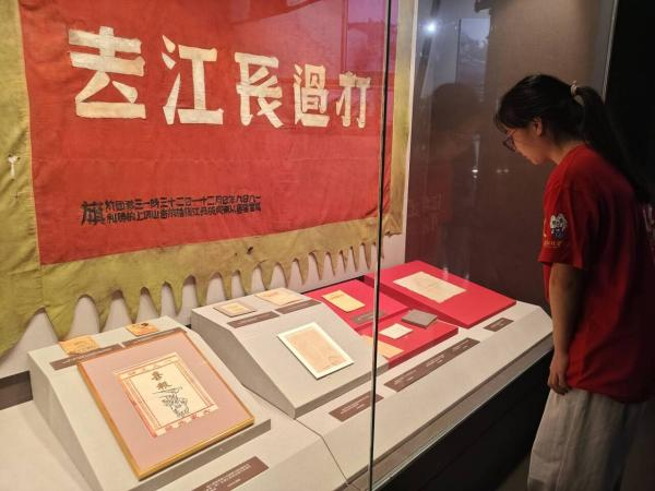 踏入纪念馆,渡江战役的磅礴气势穿透岁月扑面而来。实践团成员们长久驻足于各个展柜面前,耳边仿佛激荡着“打过长江去,解放全中国”的震天呐喊。展柜中一件弹孔累累的战士挎包,一封泛黄却字迹铿锵的“渡江决心书”,无声诉说着“人民的小木船划出了胜利大奇迹”的军民深情。