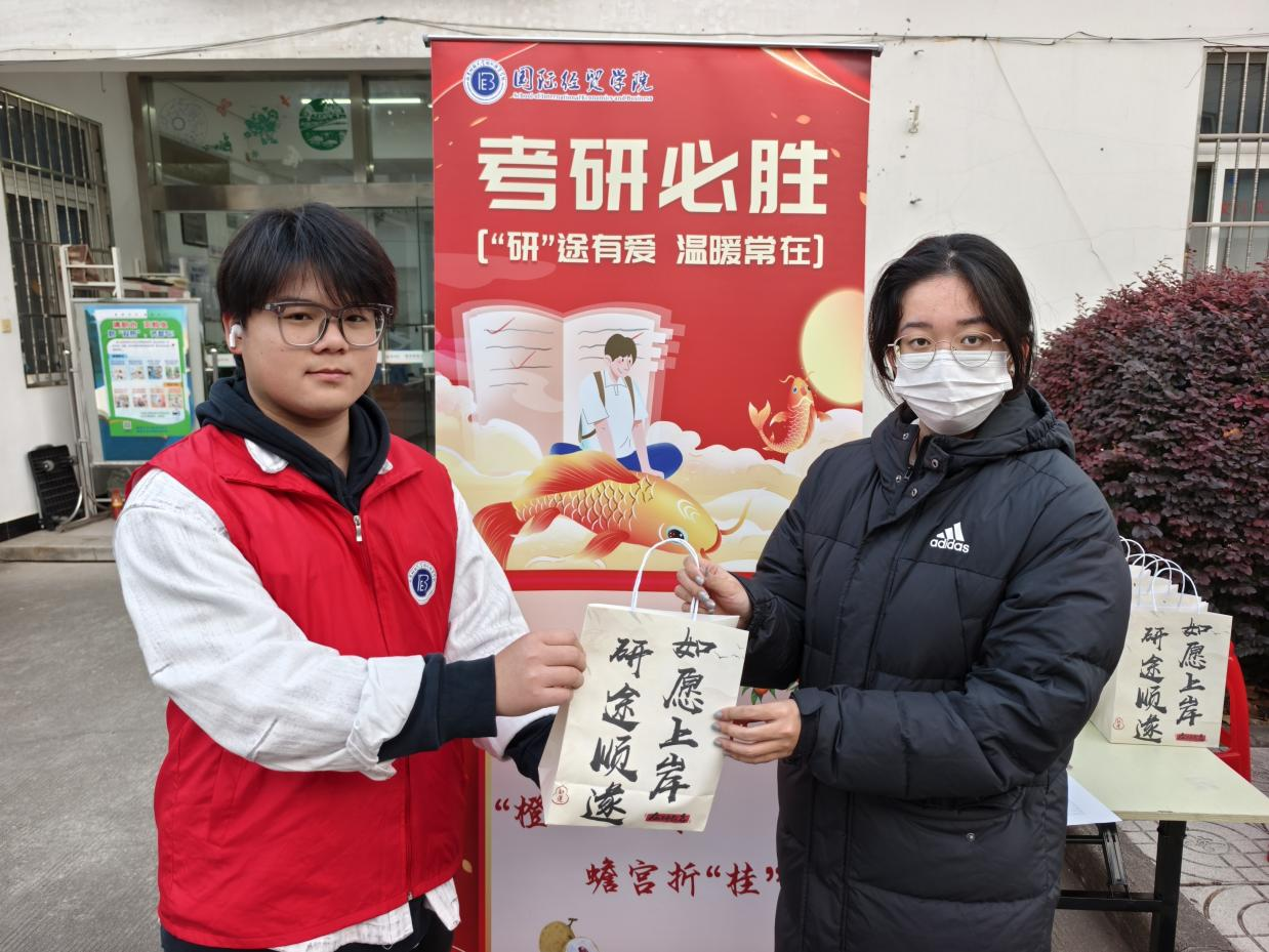 这份饱含心意的“上岸福袋”暗藏巧思:精心挑选的考试专用文具套装确保答题顺畅,刻有学院标识的定制钥匙扣寓意前程似锦,色泽鲜亮的橙子象征“成功上岸”,清甜爽口的柚子祝福“又见喜报”,果肉饱满的桂圆寄托“蟾宫折桂”的美好祝愿。从物资采购到分类打包,全程由志愿者们亲手完成,指尖传递的不仅是沉甸甸的物资,更是“薪火相传”的鼓励与守望。“接过福袋,心里暖暖的,感觉压力都减轻了一点。”国贸2204的考研同学罗光照说道。