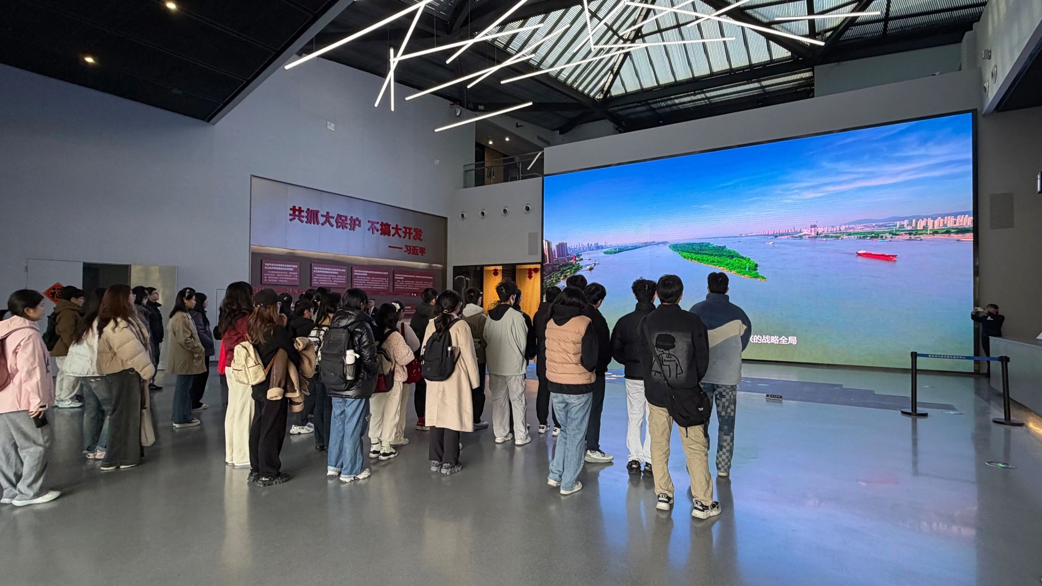 活动伊始,同学们随讲解员步入展厅,通过滨江建设微缩模型了解南京滨江区域宏大的发展蓝图。滨江九大公园、四十八处景区的细致规划让同学们意识到,城市规划并非遥不可及,生态建设融入在日常行走的每一处风景中。