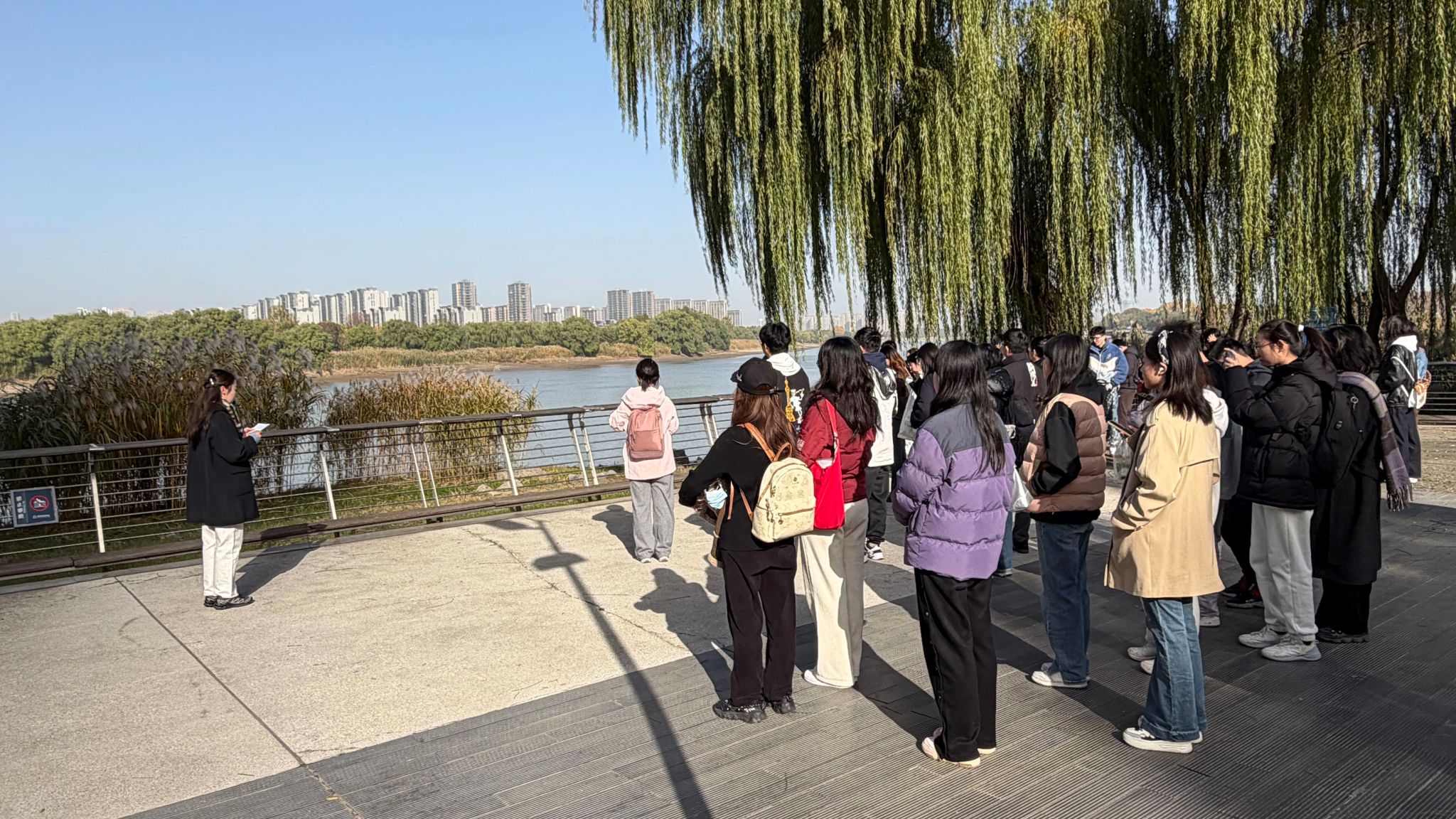 图为讲解员在江边为大家介绍滨江建设 徐吴婷摄