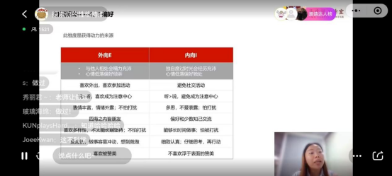 下午六点,“探索你的性格特点”课程讲座准时开始,罗纯老师一进直播间就受到了同学们的热烈欢迎,在亲切的问候和简单的介绍自己后,罗老师针对探索自身性格这一方面,提出了“性格不只是你以为的那样”的观点,随即引用了生活中常见的例子,如“想要自己安静待着不想出去玩就意味着不合群吗”“闺蜜与男友吵架,指出他们感情问题就是太冷血吗”等,引导同学们深入分析思考,通过讨论让同学们意识到自身性格倾向并不能由在某一特定时刻做出的选择而划定。