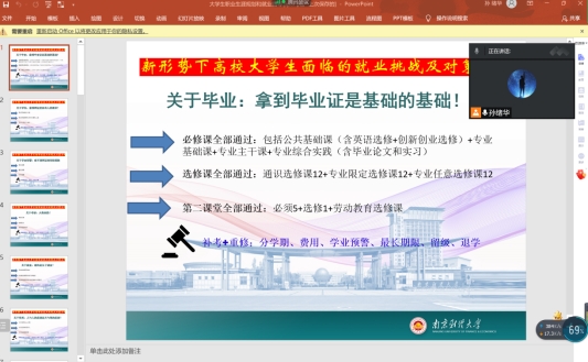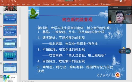 面对全院大四毕业生,举办了“新形势下高校大学生面临的就业挑战及对策分析”主题讲座,由学院辅导员孙绪华老师担任主讲人。考虑到当前疫情防控形势仍然存在不确定性风险,本着安全高效的原则,本次讲座在线上举行。
