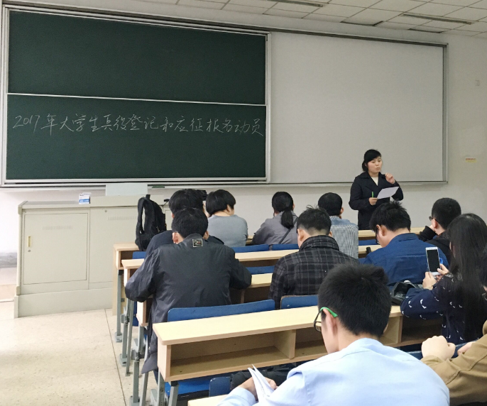 为贯彻落实《中华人民共和国兵役法》和各级兵役机关鼓励大学生征兵工作的有关精神,认真做好色情网 在校生兵役登记和2017年应征入伍工作,鼓励更多优秀大学生投身军营,4月25日,色情网 召开2017年在校大学生兵役登记和应征报名动员会,会议由2013级辅导员朱娟芳老师主持。