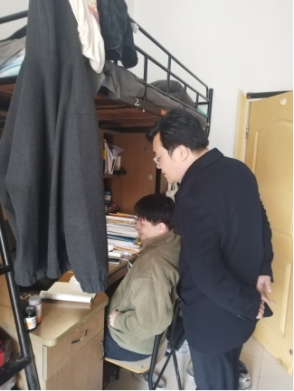 党委副书记、本科生第三党支部政治辅导员周进进走访结对学生宿舍——北苑15号站13栋606寝室,与同学们进行亲切的交谈,深入了解学生的学习、生活和思想动态,为同学们送去温暖的问候和指导。