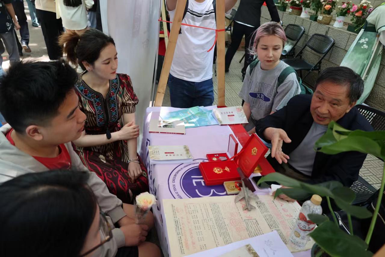 战争时期的好人好事报、《铭记实案录》回忆录、由击落的敌机残骸融制的飞机模型等老物件、闪亮如新的军功章……,刘树铭老师一一做着展示介绍,同学们纷纷被吸引前来。当刘树铭老师谈及所在部队受命开采放射性矿石时,院“两弹一星”精神宣讲团成员罗光照感慨道:“除‘两弹一星’元勋外,还有无数中国战士艰苦奋斗、无私奉献,为祖国核事业的发展奋力前行。我们要向前辈学习,成长为能吃苦有信念、堪当重任的新时代青年。”国贸2202姆娜瓦尔·买吐地对《铭记实案录》回忆录中“我们欠你一只羊”好奇地追问细节。刘树铭老师回忆起一位连长为感谢回族人民帮助部队击落敌机,在战争结束后千里送羊兑现诺言,结下回汉两族深厚淳朴的战斗情谊的往事。听至此,作为疆三代的贸经2301曾佳仪有感而发,“我的奶奶是上海的第一批支边青年,作为一名妇产科医生,与新疆人民同心协力,共建美好家园。战争年代的民族情谊延续至今,之后也将在新一代青年的奋斗中得以传承。” 刘树铭老师还与同学们一起畅谈学习生活中的趣事与烦恼,探讨入党初心与人生规划。老党员讲得眉飞色舞,同学们听得聚精会神,频繁的交流互动引来了更多同学的围观。摊位前人头涌动、热闹非凡。