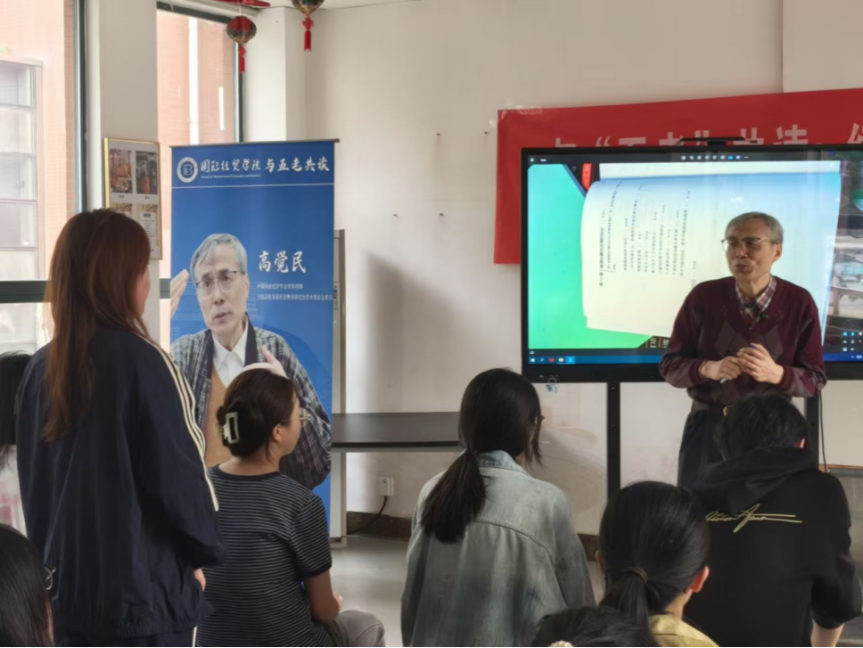 互动交流环节,现场氛围热烈活跃。同学们结合国际经济形势等现实问题,围绕专业学习踊跃发言,提出疑惑。有同学问道:“当前国际形势复杂多变,经济安全面临挑战,经济大环境承压,不少人都选择躺平摆烂,作为经贸学子,应该如何看待和破局?”高觉民教授认真回应并勉励大家:面对复杂外部环境与经济安全压力,青年学子更应拒绝“躺平”。经济安全是国家安全的重要基石,经贸学子要认清使命、主动担当,将个人成长与国家需要紧密结合。深耕专业知识,强化国际经贸、金融风险防控与跨境贸易安全等核心能力,在变局中坚定定力、锤炼本领,把挑战化为成长机遇,以实干守护国家经济金融安全,在服务国家发展中实现自身价值。