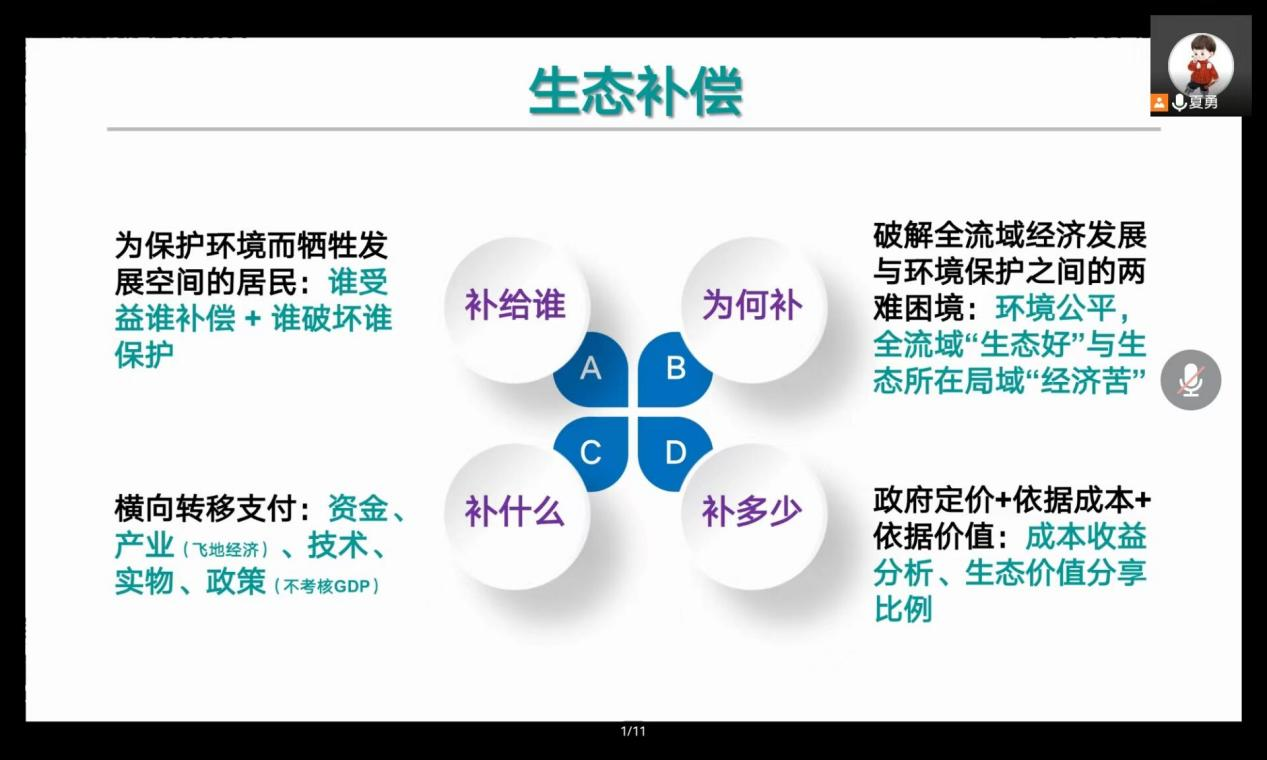 本次期中教学观摩会分三个阶段进行。首先,夏勇老师围绕“区域市场产品及其区际贸易形式”主题展开讲述。他基于“知识讲授+案例剖析+提问互动”等教学方式,分别从区域市场产品的分类与区际贸易形式、区域—区域市场—区域市场产品(生态产品)的概念界定与特征分析以及生态产品交易与包容性利益三个方面阐述了本次会议的核心内容。其次,课上师生互动。这一阶段以“提问+课后作业”方式展开。学生围绕“为何‘共抓大保护,不搞大开发’?”问题进行了深入讨论。最后,与会教师就此次教学内容、教学效果等展开了经验交流。校督导胡雅蓓教授指出,当前线上教学普遍面临着师生互动较难、课程思政融入不高、学生吸收知识较弱等共性难题,通过此次教学观摩可以发现上述问题得到了较大程度缓解。院督导陶金国认为这门课程虽具有一定挑战性,但授课教师准备充分,师生互动频繁,授课效果良好。任课老师表示未来会结合自身优势,更好提高师生互动效果,同时更恰当“用学术讲政治”,打磨课程。