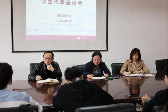 于4月21日召开了电子商务专业2019、2020级本科生学生代表座谈会,和学生代表谈心谈话,“问民盼、亮清单”。学院党委书记张阳军、副院长杨智华出席座谈会,会议由电子商务专业辅导员董敏主持。
