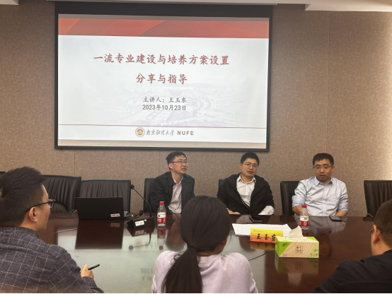 目前一流专业建设的成效和培养方案设置的基本情况。随后,王群伟教授就一流专业建设与培养方案设置进行了经验分享。他强调本科生教育要优化课程设置,拓宽课程内容,将其他相关学科课程融入学习;要重视师资队伍建设,储备多样性人才,一流的师资队伍是支持一流专业建设的坚实基础;要加强兄弟学院之间的合作与交流,资源互享,推动一流专业建设。