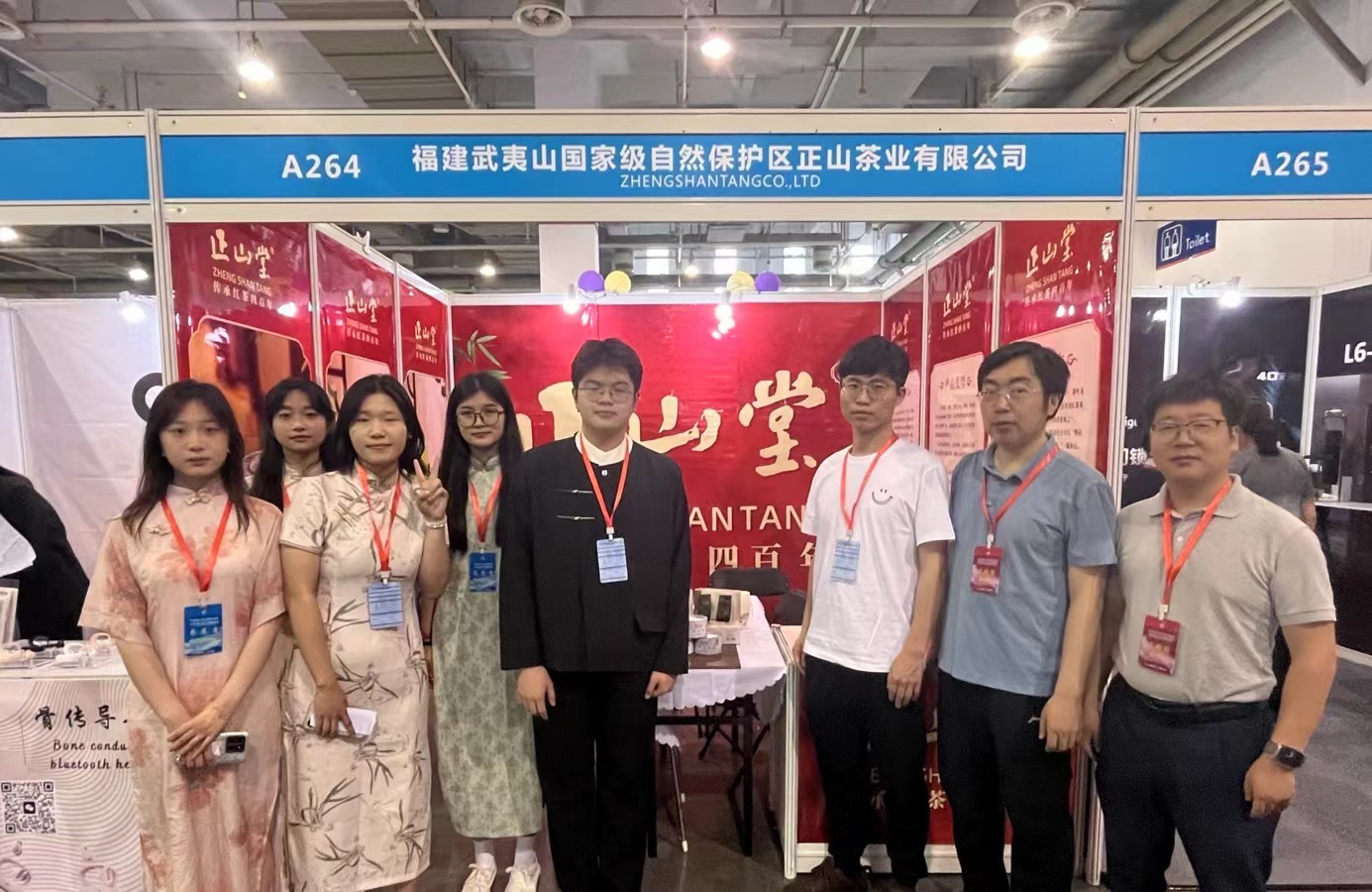 在展位布置环节,成员们事先对展位背景板进行设计,以“东方红”作为基础色调,正面背景板为品牌Logo,右边的背景板为企业的基本介绍和理念,左边的背景板为主推的产品介绍,包括金骏眉、妃子笑和一周茶事。之后在展位设置了横桌作为商务谈判的场地,在桌子上摆放了主推的三种茶叶产品,并安排专员进行泡茶,以供买手品鉴。