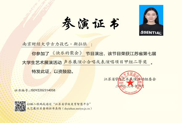 声音落入声音,于是有了最美的合唱与和弦。大一时,古力孜巴·斯拉依加入了校合唱团组织,在刘念老师的指导下,她学习到了很多合唱技巧,包括如何正确发声、如何头腔共鸣,这帮助她提高个人能力,也让团队合作更加默契和专业。2023年,古力孜巴·斯拉依所在的合唱团在学校举办了音乐会,并多次去校外进行演出,在该年年底参加了江苏省第七届大学生艺术展演活动。荣获了两项省级奖项,一项国家级奖项,古力孜巴·斯拉依也因此荣获了校长奖学金。